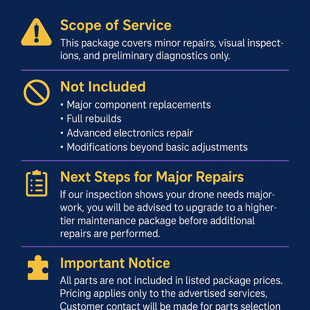 If our inspection shows your drone needs major work, you will be advised to upgrade to a higher-tier maintenance package before additional repairs are performed.