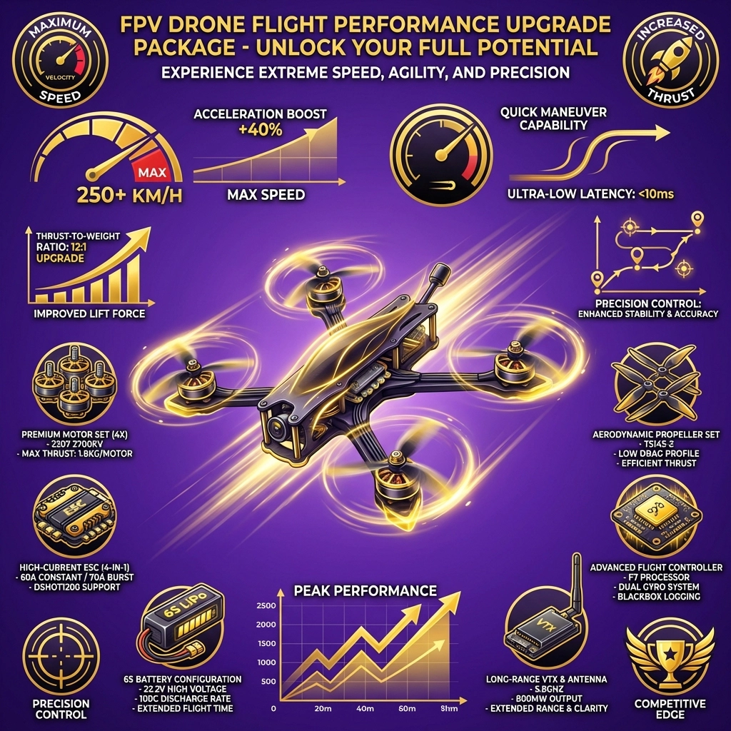 Unlock the full potential of your FPV drone with TechInMotion360’s Flight Performance Package Upgrades. Built for pilots who want maximum speed, agility, and control, this package delivers measurable gains in responsiveness and overall flight capability.